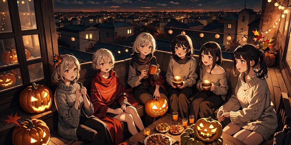 - Rooftop Parties: Cozy urban gatherings with string lights, carved jack-o-lanterns, knit blankets, spiced cider, and oversized-sweater girls laughing against city skylines at dusk.